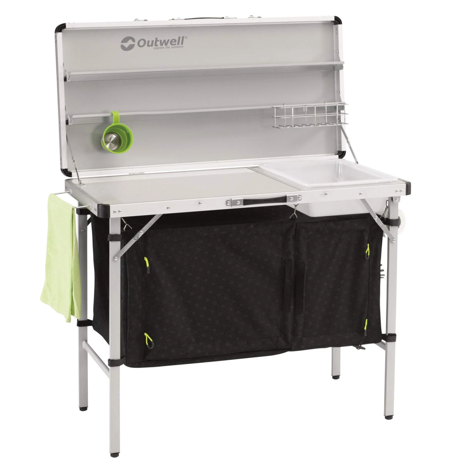 Stabiles Möbel für deine Outdoor-Küche: Arbeitsplatte und Spülwanne finden sich hier unter einem Deckel, der aufgeklappt als Regal dient. Außerdem gibt es praktischen geschlossenen Stauraum.